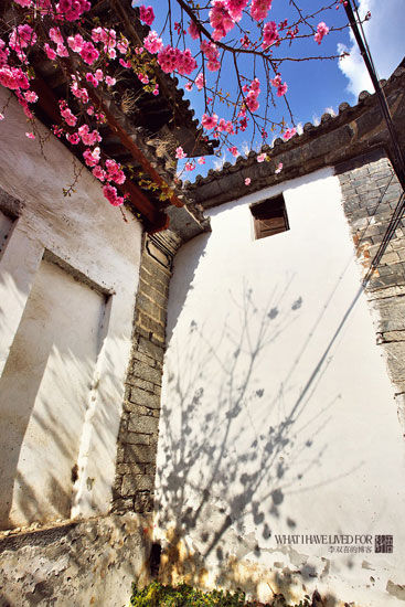 喜洲应该有更多的故事,只是无缘邂逅。我见到的她,寂静、恬适,少了些许的烟火气息。拐角的路边,白墙倒映着樱花流散的水墨剪影,绚目璀璨。先人们栽种的树木,绽放着朵朵童话,满是童话的树下,似乎都有一把竹椅,竹椅摇晃着渐渐停息,春风缕缕,吹冷离别的余温。每一位别离者的心中,都深藏着一方瓦屋,一杯香茗,一床暖褥,一声娘亲的唤归声……